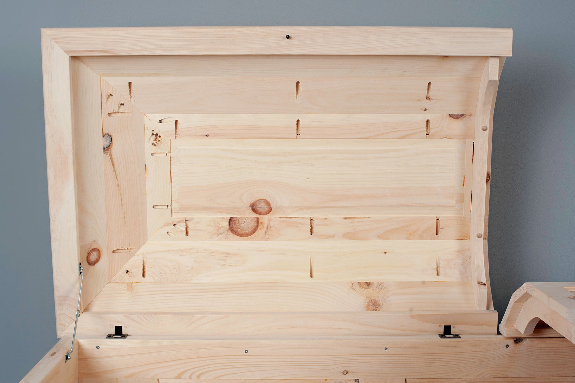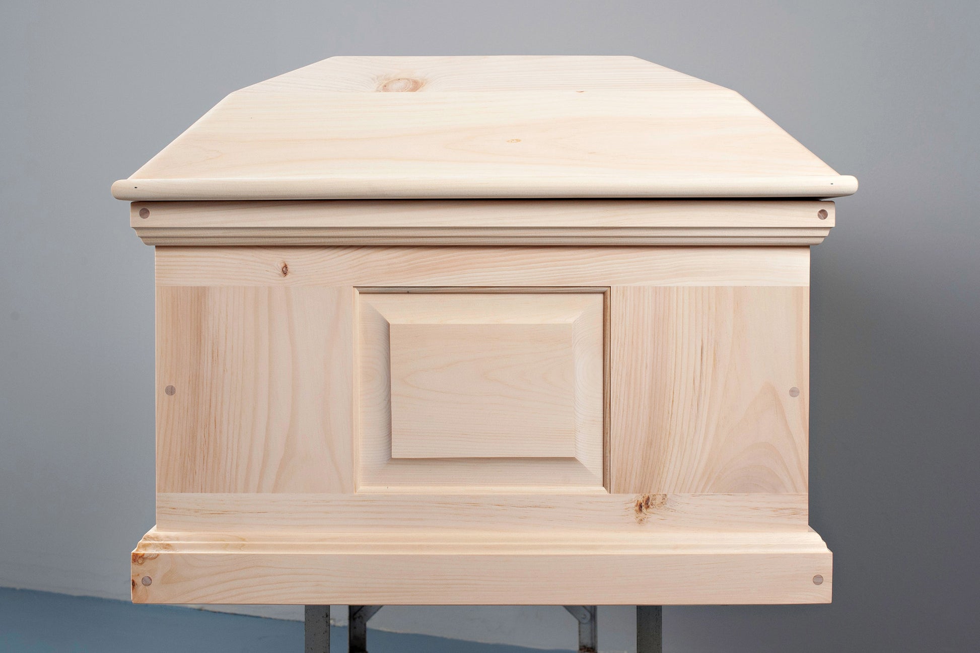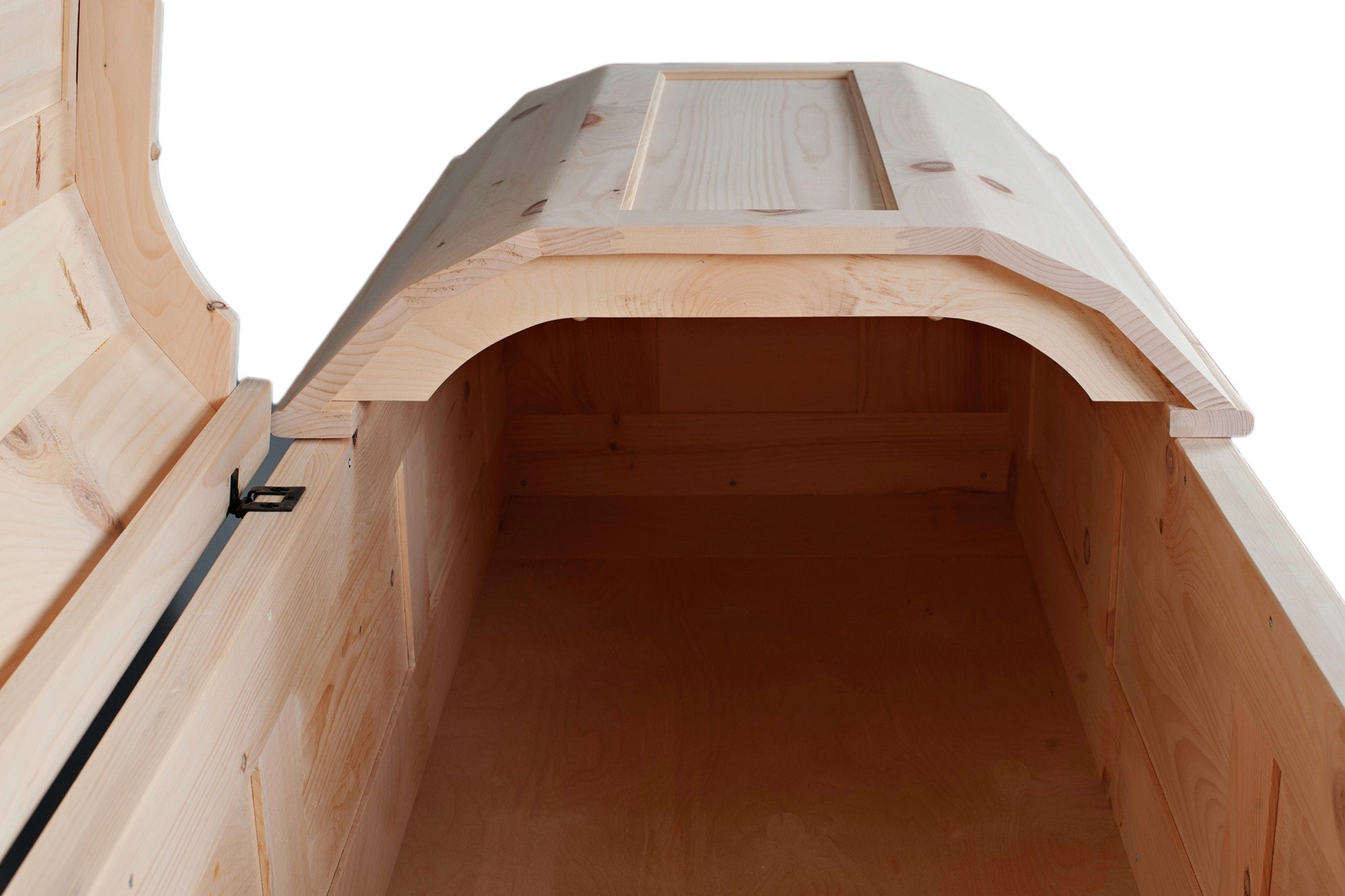 We call this design the Craftsman Panel casket because the sides and lid are constructed from floating or "raised" panels common in Arts & Crafts era furniture and modern cabinetry today. With the flat panels you do not need a special rounded edge gluing jig for the lid.